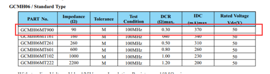 谷景對(duì)應(yīng)GCMH06系列貼片共模電感的參數(shù):90Ω的阻抗、370mA的額定電流、0.3Ω的直流電阻。