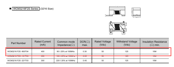 WCM3216系列貼片共模電感的參數(shù):90Ω的阻抗、400mA的額定電流、0.3Ω的直流電阻。